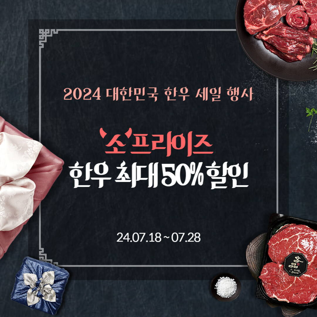 2024년 7월 18일부터 7월 28일까지 한우농가를 돕고 소비자에게 저렴한 가격으로 한우를 제공하기 위한 '소프라이즈 2024 대한민국 한우 세일' 행사가 열립니다.
